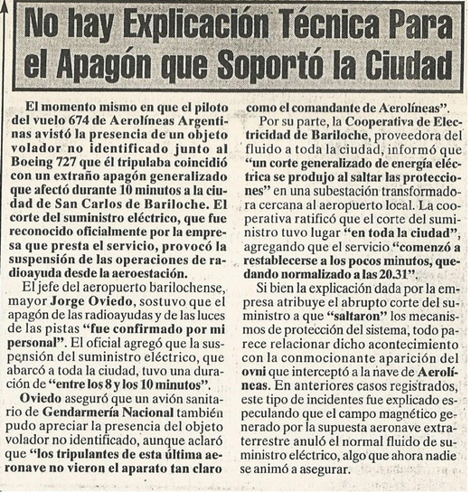 “Influyo quiza la proximidad del ovni sobre el grupo electrogeno del aeropuerto y eso fue lo que provoco el corte de energia”.