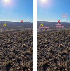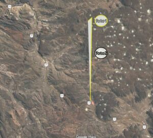 Donde se marca la X amarilla es la posición de observación de los testigos. La Cruz blanca, es donde en primera instancia ven la luz, que se ubica sobre la cumbre del cerrito. Allí se obtiene la primera imagen catalogada como FOTO1.  Sin emabargo la pareja de la testigo, quien primero toma contacto con el evento, logra un video de 3 segundos que compartimos a continuación.