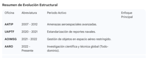 Para entender la evolución de la investigación de UAPs dentro del Pentágono, es necesario ver cómo pasaron de ser proyectos «en la sombra» a oficinas oficiales creadas por ley.