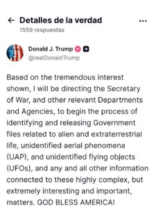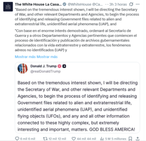 “Con base en el enorme interés demostrado, ordenaré al Secretario de Guerra y a otros Departamentos y Agencias relevantes que comiencen el proceso de identificación y divulgación de archivos gubernamentales relacionados con vida extraterrestre, fenómenos aéreos no identificados (FANI) y objetos voladores no identificados (OVNI), y cualquier otra información conectada a estos asuntos altamente complejos, pero extremadamente interesantes e importantes”, dijo en una publicación en Truth Social.