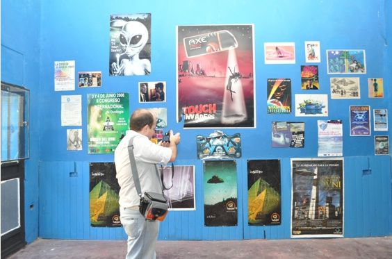 En ese mismo ambiente, tambien hay una recreacion del muñeco alien, que con un dibujo realzado por el artista, pareciera descender de un ovni que lanza un rayo.