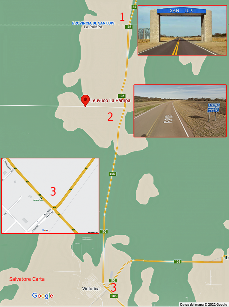 Al tomar contacto periodítico con el caso, me contacte con quien conducía la camioneta en la que se movilizaban por Ruta 105. El Sr. refiere que aproximadamente entre las 0:10 hs del ya iniciado viernes 4 de Febrero, cruzan el limite Portico de San Luis hacia La Pampa. La madre de uno de los testigos (ubicada detrás en la cabina), luego de unos kilómetros hacia el Sur, consulta donde esta Leuvuco, y en segundos ven el cartel que lo indica.